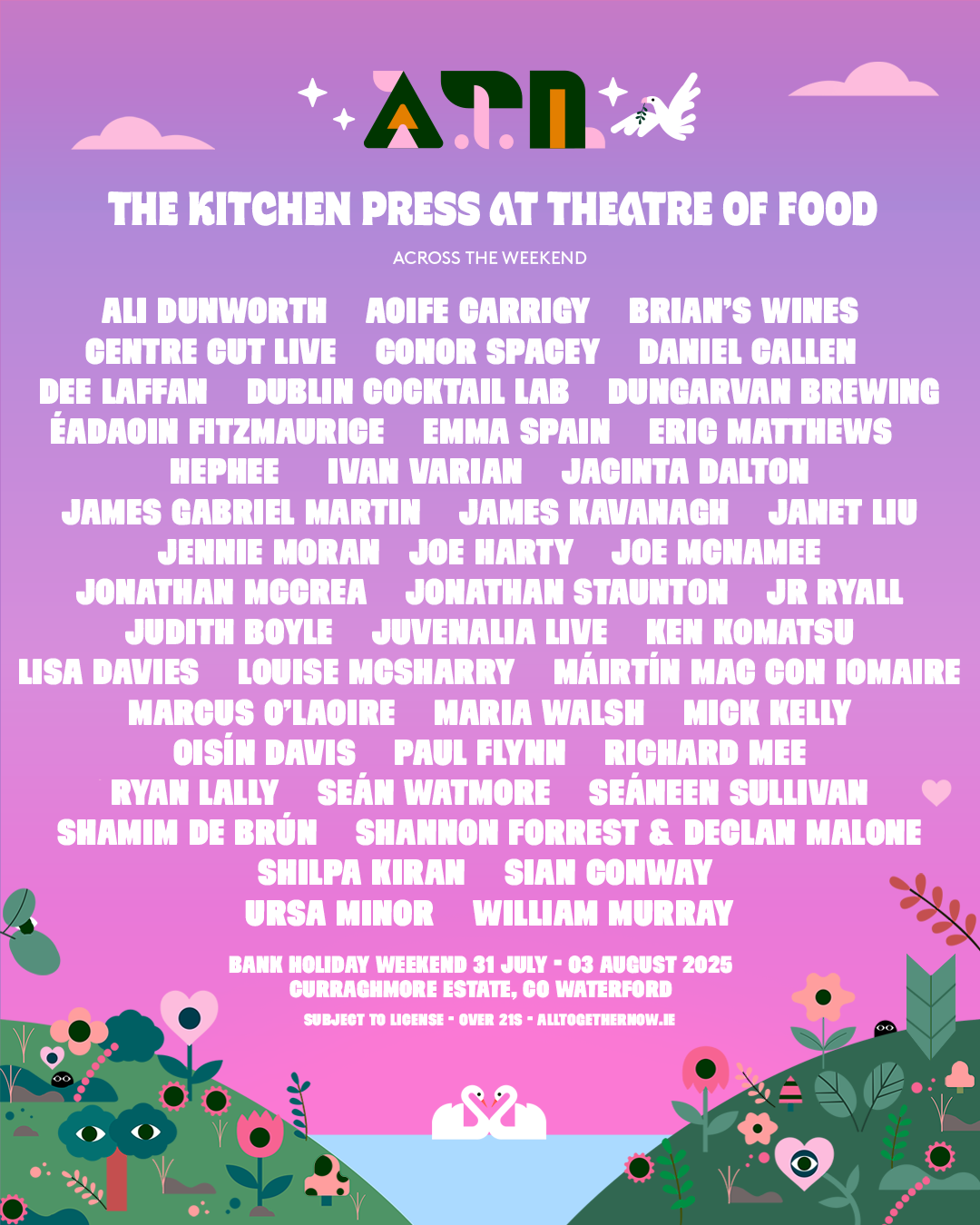 The Kitchen Press at All Together Now is a bit of everything you might find in and around a kitchen - food, drinks, chats, stories. Think of it as finding the kitchen at a house party. Hosted by Ali Dunworth and guests across the weekend, it will be a place to congregate and refuel. You come for a sit down, but you stay for the craic. Drinks will be made, stories will be told. We will delve into the wide world of food and drink culture through great chats and unexpected topics. Lots of audience interaction, no typical cooking demos, think interactive tastings, unexpected chats and lots more. You never know what’s going to happen at the Kitchen Press…